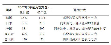 在太陽(yáng)能發(fā)電上領(lǐng)先的歐洲,主要采用電力公司以高于普通電力的價(jià)格購(gòu)買太陽(yáng)能發(fā)電系統(tǒng)所發(fā)的電力。而美國(guó)和日本則采用與普通電力相同的價(jià)格購(gòu)買太陽(yáng)能發(fā)電系統(tǒng)所發(fā)的電力。美、日還補(bǔ)助用戶購(gòu)置太陽(yáng)能發(fā)電系統(tǒng)。下表列出了幾個(gè)先進(jìn)國(guó)家的太陽(yáng)能發(fā)電的發(fā)電量(單位為百萬(wàn)瓦)和補(bǔ)助措施。
