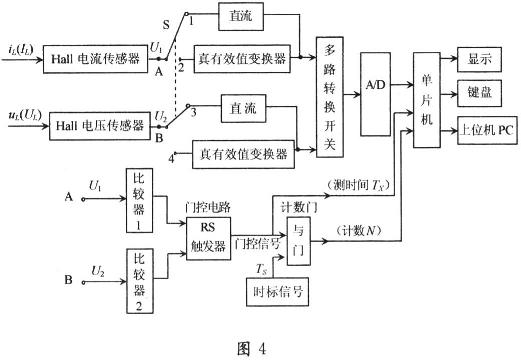 由正弦交流電有功功率的定義P=UIcosψ可知,只要準確測量出U,I及電流與電壓相位差ψ,就可算出P與cosψ。采用傳統(tǒng)的電磁式電壓、電流互感器進行測量,由于互感器的非理想性,除存在變比誤差外,更主要的是存在較大的相位誤差,這就使測得的ψ值不能真實地反映負載的性質(zhì)。若采用霍爾電壓、電流傳感器及真有效值轉(zhuǎn)換器(如AD637)等,可以使功率及功率因數(shù)的測量精度大大提高。