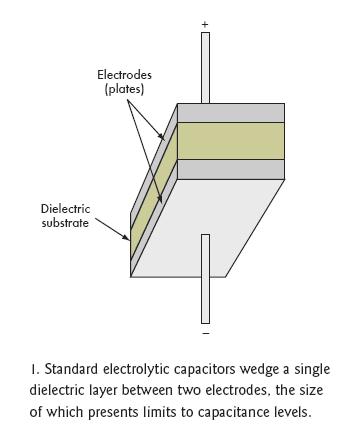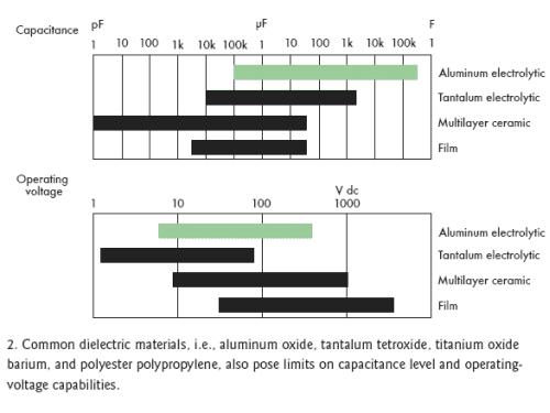 [page]標準電容的結構是在兩個附屬于金屬板上的電極之間夾一層電介質(zhì)層(圖1)。根據(jù)電容類型不同,電介質(zhì)可以是氧化鋁、四氧化鉭、氧化鈦鋇或聚丙烯聚酯,不同的材料決定了不同的容量和電壓特性(圖2)。電介質(zhì)的多少和極板間的距離也會影響電容量。然而,極板間最大允許距離限制了電介質(zhì)的數(shù)量。
