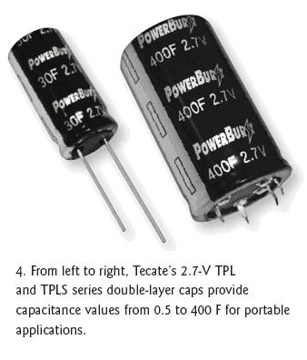 TecateGroup推出了具有多樣配置的多種PowerBurst品牌超級電容器。針對通用的脈沖電源、混合電池和便攜式產(chǎn)品應用,徑向引線的TPL和徑向折彎的TPLS系列雙層電容器分別具有0.5F到70F和100F到400F的容量(圖4)。這兩類器件的電壓額定值都是2.7V,工作溫度范圍是-40℃到65℃。TPL和TPLS系列的最大高度分別是45mm(100F)和60mm(400F)。