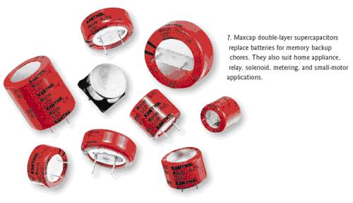 KanthalGlobar公司的Maxcap雙層電容器可以用來代替作為存儲器后備電源的電池,具有超過5.5F/in.3的容積效率、無限的服務壽命、快速充放電能力和非常低的漏電流等特性(圖7)。KanthalGlobar公司還表示,這些電容比電池更安全,在短路時不會爆炸,也不會損壞。這些電容器是非極化器件,不需要限流電阻或過壓保護,因而可以消除裝配錯誤和相關的成本。