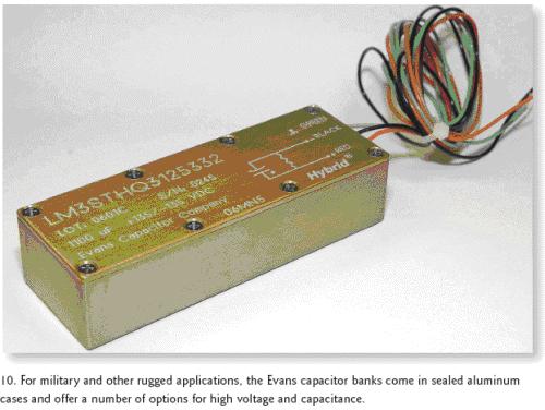 [page]EvansCapacitor公司的3STHQ3和3PTHQ3電容組器件則主要用于任務繁重的軍事應用,它將公司的三個THQ3混合電容集成進了一個陽極電鍍、環(huán)氧密封的鋁殼中,整個尺寸為4.47×1.59×1.09英寸(圖10)。針對更高的工作電壓,3STHQ3組可以串聯(lián)電容的方式提供以下四種產(chǎn)品:0.004F/160Vdc,0.0028F/200Vdc,0.0019F/250Vdc和0.0011F/300Vdc。