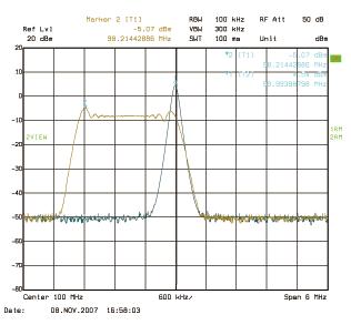 Spread Spectrum Oscillator),來(lái)降低系統(tǒng)輻射出來(lái)的EMI電磁輻射干擾。圖4則顯示一個(gè)單頻信號(hào)的頻譜圖以及對(duì)該信號(hào)展頻后的頻譜圖。從圖中可知展頻后的頻率信號(hào)如何降低原來(lái)在接近100MHz的峰值。