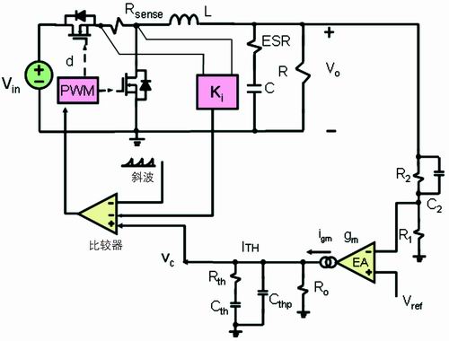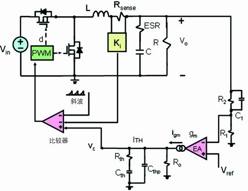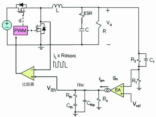 通過前面的討論可知,在每個開關(guān)周期,低端的開關(guān)管流過的電流波形為下降階段的梯形波。這種電流模式常稱為谷點電流模式。和峰值電流模式一樣,谷點電流模式反饋也有兩個環(huán)路:一個電壓外環(huán),另一個是電流內(nèi)環(huán)(見圖2)。