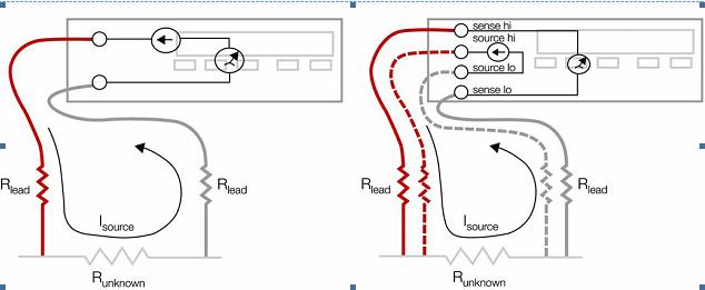 源端引線中的串聯(lián)電阻不影響電流流動(dòng)。測(cè)量/傳感引線幾乎沒有電流流動(dòng),因?yàn)閮x表的輸入阻抗很高。這意味著測(cè)量引線中沒有I x R電壓下跌。因此,您只需測(cè)量由于流經(jīng)的源電流而在未知電阻器中產(chǎn)生的電壓下跌。