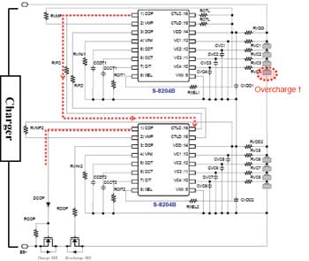 下面,詳細(xì)介紹一下保護(hù)芯片級聯(lián)的具體工作情況。還是以S-8204B為例,其CTLC端子可由芯片外部控制COP端子的輸出電壓、而CTLD端子則可由芯片外部控制DOP端子的輸出電壓。通過CTLC端子以及CTLD端子可以分別單獨(dú)控制COP端子與DOP端子的輸出電壓。并且,這些控制功能優(yōu)先于芯片內(nèi)部的電池充放電保護(hù)功能。如果8節(jié)電池中的某一節(jié)電池發(fā)生過充,與該電池相連接的S-8204B的COP端子輸出電壓會發(fā)生變化,該電壓變化會傳遞到與其相連接的另一個(gè)S-8204B的CTLC端子,使得另一個(gè)S-8204B的COP端子輸出電壓也發(fā)生變化,從而控制充電控制用MOSFET關(guān)斷,實(shí)現(xiàn)鋰離子電池的過充電保護(hù)。