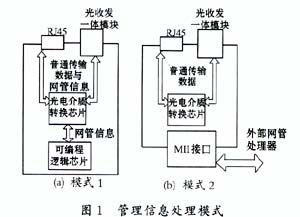 收發(fā)器網管功能的實現(xiàn)有兩種方式:一種是在收發(fā)器電路板上配置網絡管理信息處理器——可編程邏輯芯片來處理網管信息,該芯片利用OEMC上的雙向管理指令接口(Managenent Data Input/Output,MDIO)、管理數(shù)據(jù)同步時鐘輸入接口(ManagenentData Clock,MDC)及被管理信息輸入/輸出管腳等接口來獲取管理信息,管理信息與網路上的普通數(shù)據(jù)共用數(shù)據(jù)通道,如圖1(a)所示。第二種方式如圖1(b)所示,收發(fā)器上沒有管理信息處理器,收發(fā)器外部的網絡管理者通過MII接口獲取管理信息。可見,有網管功能的收發(fā)器,其元器件種類及數(shù)量遠遠多于無網管收發(fā)器,相應地,其布線復雜,開發(fā)周期長。