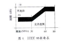 雙絞線中的每對導線以雙螺旋形結構相互纏繞。如圖2所示,共模電流Icom在兩根導線上以相同方向流動,并經過寄生電容Cp到地返回。在這種情況下,電流產生大小相等極性相同的磁場 ,它們的輸出不能相互抵消,引起射頻干擾,嚴重時有可能會造成電路板癱瘓。因此,設計者必須采取措施予以防范:除了保證布線合理外,選擇有效的濾波元件也是重要的一方面。磁模塊的共模扼流器部分可以有效地減少共模信號引起的射頻干擾。如圖3所示:共模電流以相同的方向流過共模扼流圈繞組的每一邊,建立大小相等相位相同的相加磁場使共模扼流圈對共模信號呈現(xiàn)高阻抗,通過共模扼流圈的共模電流大大地減弱。磁模塊主要的參數(shù)有:漏電感、線間電容和回損。一般地,漏電感和線間電容越小性能越好,而回損應當符合ANSIX3.263 TP-PMD規(guī)定,如圖4所示。