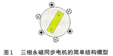 三相混合式步進電機的工作原理十分類似于永磁同步伺服電機。其轉(zhuǎn)子上所用永磁磁鐵同樣是具有高磁密特性的稀土永磁材料,所以在轉(zhuǎn)子上產(chǎn)生的感應(yīng)電流對轉(zhuǎn)子磁場的影響可忽略不計。在結(jié)構(gòu)上,它相當于一種多極對數(shù)的交流永磁同步電機。由于輸入是三相正弦電流,因此產(chǎn)生的空間磁場呈圓形分布,而且可以用永磁式同步電機的結(jié)構(gòu)模型(見圖1)分析三相混合式步進電機的轉(zhuǎn)矩特性。為便于分析,可做如下假設(shè):