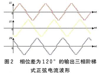 以上分析表明,對于三相永磁同步電機,當三相繞組輸入三相對稱的正弦電流時,由于在內(nèi)部產(chǎn)生圓形旋轉(zhuǎn)磁場,電機的輸出轉(zhuǎn)矩為恒值。因此,將交流伺服控制原理應(yīng)用到三相混合式步進電機驅(qū)動系統(tǒng)中,輸入的220V交流,經(jīng)整流后變?yōu)橹绷鳎俳?jīng)脈寬調(diào)制技術(shù)變?yōu)槿冯A梯式正弦波形電流(見圖2),它們按固定時序分別流過三路繞組,其每個階梯對應(yīng)電機轉(zhuǎn)動一步。