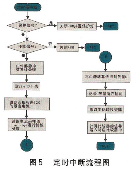 圖4示出主程序流程圖,圖5示出定時中斷流程圖。為減少功耗和保護電機,設(shè)置了自動半電流功能(靜態(tài)鎖軸或沒有脈沖輸入時電流減半),它由滯環(huán)比較器自動進行調(diào)節(jié)。