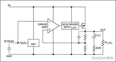 低壓差線性穩(wěn)壓器(LDO)的結構主要包括啟動電路、恒流源偏置單元、使能電路、調(diào)整元件、基準源、誤差放大器、反饋電阻網(wǎng)絡,保護電路等,基本工作原理是這樣的:系統(tǒng)加電,如果使能腳處于高電平時,電路開始啟動,恒流源電路給整個電路提供偏置,基準源電壓快速建立,輸出隨著輸入不斷上升,當輸出即將達到規(guī)定值時,由反饋網(wǎng)絡得到的輸出反饋電壓也接近于基準電壓值,此時誤差放大器將輸出反饋電壓和基準電壓之間的誤差小信號進行放大,再經(jīng)調(diào)整管放大到輸出,從而形成負反饋,保證了輸出電壓穩(wěn)定在規(guī)定值上;同理如果輸入電壓變化或輸出電流變化,這個閉環(huán)回路將使輸出電壓保持不變,即: