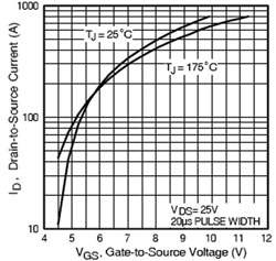在MOSFET的數(shù)據(jù)表中,通??梢哉业剿牡湫偷膫鬏斕匦浴W⒁獾?5℃和175℃兩條曲線有一個交點(diǎn),此交點(diǎn)對應(yīng)著相應(yīng)的VGS電壓和ID電流值。若稱這個交點(diǎn)的VGS為轉(zhuǎn)折電壓,可以看到:在VGS轉(zhuǎn)折電壓的左下部分曲線,VGS電壓一定時,溫度越高,所流過的電流越大,溫度和電流形成正反饋,即MOSFET的RDS(ON)為負(fù)溫度系數(shù),可以將這個區(qū)域稱為RDS(ON)的負(fù)溫度系數(shù)區(qū)域。