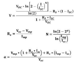 為了能夠精確仿真太陽能電池板在特定環(huán)境條件下的輸出(特別是對于小功率逆變器,仿真精度的要求往往更高),很多廠家推出了專用的太陽能方陣模擬器,用于模擬各種環(huán)境下太陽能電池板的輸出特性,精確地復(fù)現(xiàn)出不同環(huán)境條件下的I-V輸出特性曲線。I-V曲線的數(shù)據(jù)多來自于用戶對太陽能電池板輸出的實際測量結(jié)果。為了簡化操作,目前國際上通用的曲線設(shè)置方式是:通過I-V曲線上的四個特征值,即Voc(開路電壓值)、Isc(短路電流值)、Vmp(最大功率點電壓值)、Imp(最大功率點電流值)來擬合得到完整的I-V曲線。所使用到的公式如下所示:
