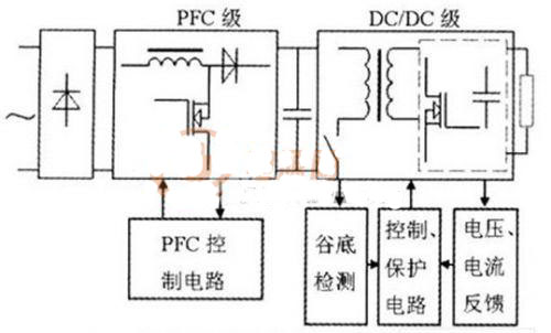 所研究的開關(guān)電源結(jié)構(gòu)如圖1所示,采用兩級(jí)PFC結(jié)構(gòu),由PFC預(yù)變換器、隔離變換器和同步整流電路組成的DC/Dc變換器以及檢測(cè)與保護(hù)電路組成。交流電壓經(jīng)整流后先輸入到PFC預(yù)變換器進(jìn)行功率因數(shù)校正變換,再由電源控制電路控制隔離變換器,將直流電壓轉(zhuǎn)換成高頻交流脈沖電壓,此脈沖電壓經(jīng)同步整流器整流、濾波電路濾波后,得到所需的直流。