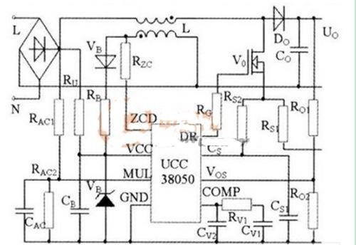 功率因數(shù)校正電路原理如圖4所示。電路中,電感L、功率MOS開關(guān)管Vo、二極管Do和電容Co組成Boost變換器。電阻分壓器RAc1和RAc2對(duì)輸入電壓波形取樣,獲得輸入電壓前饋信號(hào),作為控制芯片UCC38050內(nèi)部乘法器的一個(gè)輸入,與電源反饋信號(hào)一起生成電感電流參考信號(hào)。電阻Rzc將電感電流過零信號(hào)輸入芯片,以控制開關(guān)管零電流開通。電阻Rs1檢測(cè)開關(guān)管電流,輸出電壓經(jīng)Ro1和Ro2分壓后反饋給芯片。這些信號(hào)輸入芯片后,經(jīng)過UCC38050內(nèi)部運(yùn)算與控制,形成PWM控制信號(hào),控制開關(guān)管通斷,使電流波形跟蹤電壓波形,實(shí)現(xiàn)功率因數(shù)校正。