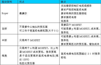 可以用多種架構(gòu)產(chǎn)生驅(qū)動CCFL所需的交流波形,包括Royer(自振蕩,self-oscillating)、半橋、全橋和推挽。表1詳細歸納了這四種架構(gòu)各自的優(yōu)缺點。
