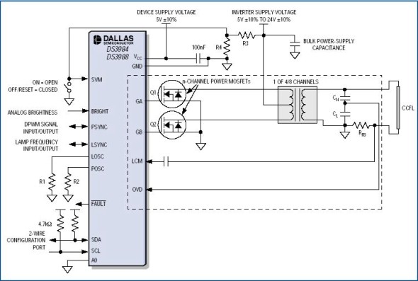 DS3984/DS3988采用推挽驅(qū)動架構(gòu),可以使用更低成本、更高效率的n通道MOSFET。轉(zhuǎn)換器直流電源電壓也可采用更高的電壓。單獨的燈控制和監(jiān)測可提供均勻的亮度,并減少轉(zhuǎn)換器的元件總數(shù)。采用單獨的燈控制時,如果某一個燈失效,僅會使這個失效的燈停止工作,其他燈繼續(xù)工作,并不會受影響。片上振蕩器產(chǎn)生的燈頻和脈沖調(diào)光頻率被嚴格限定在±5%水準,消除了對於顯示影像的影響,并且也可被同步至外部時脈源。