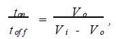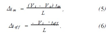 可以認為Δi就是電感線圈中的紋波電流,將導通和關(guān)斷狀態(tài)時的時間和電壓式(2)和式(3)代入上式,分別寫出導通狀態(tài)和關(guān)斷狀態(tài)時的紋波電流表達式: