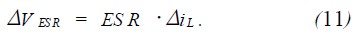 計算第二部分,對于一般電容,都具有串聯(lián)等效電感和串聯(lián)等效電阻(其實還有并聯(lián)等效絕緣電阻)。串聯(lián)等效電感只在較高頻率時起作用,在分析開關(guān)頻率時可以將其忽略,但必須考慮的是串聯(lián)等效電阻ESR.電流ΔiC流過ESR時,會在ESR兩端產(chǎn)生電壓降,其值為: