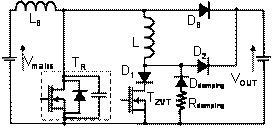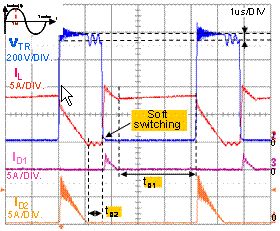 從理論上講,因?yàn)樗械拈_(kāi)關(guān)損耗都被消除,零壓轉(zhuǎn)換(ZVT)是功率因數(shù)校正(PFC)應(yīng)用最理想的拓?fù)?。此外,不管輸入和輸出功率如何變化,這種電路都能正常工作。然而,在實(shí)際應(yīng)用中,升壓二極管DB的反向恢復(fù)電流對(duì)零壓轉(zhuǎn)換電路的影響非常明顯,致使電感和最小占空比都受到一定程度的限制。因?yàn)樾【€圈L上的重置電流,D2 的反向恢復(fù)電流包含高應(yīng)力電壓和寄生阻尼振蕩。最后,PN二極管的動(dòng)態(tài)特性影響零壓轉(zhuǎn)換(ZVT)電路的總體能效,因?yàn)檫@個(gè)晶體管的導(dǎo)通時(shí)間應(yīng)該增加,而且為降低半導(dǎo)體器件遭受的電應(yīng)力,必須增加一個(gè)有損緩沖器。