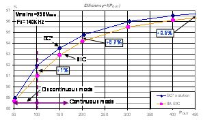 一旦功率因數(shù)校正器進(jìn)入斷續(xù)模式(<100 W),碳化硅二極管與BC²電路的能效相同,如圖8所示。