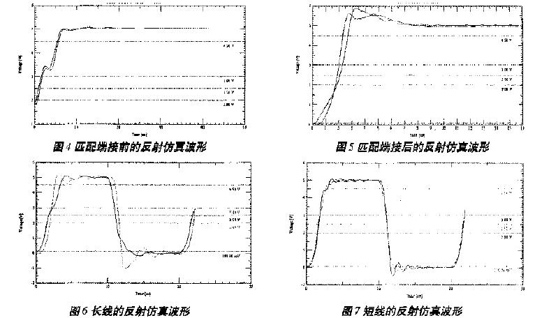 用頻率為50MHz,占空比為0.5的Pulse信號作觸發(fā),圖4和圖5分別為利用Signoise工具仿真得到的匹配端接前、后的仿真波形。從圖中可以看出,端接前,波形在上升沿有畸變發(fā)生,容易引起誤操作。匹配端接有效地消除了信號的畸變,單調(diào)性很好,而且在上升沿拉升了原信號,提前進入電平切換,增加了信號的穩(wěn)態(tài)時間,信號的上升沿也比較平穩(wěn)。雖然在高電平的維持階段有上過沖,但對信號確認沒有影響,信號質(zhì)量比較理想。另外,信號傳輸線長度對反射也有一定的影響。仿真發(fā)現(xiàn),傳輸線較長時,出現(xiàn)了預(yù)示的反射現(xiàn)象,如圖6所示;而傳輸線較短時,仿真波形和分析結(jié)果吻合得很好,如圖7所示。表1為上述兩種情況下的波形仿真參數(shù)。所以,布線長度不同,其處理方法也應(yīng)不同。一般來說,走線長度小于2英寸,以集總參數(shù)的LC電路來處理;大于8英寸,則以分布參數(shù)的傳輸線電路來對待。