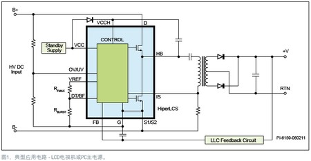 在高壓電源轉(zhuǎn)換電路設(shè)計中,諸如電源噪聲、開關(guān)頻率、開關(guān)損耗、電源體積、可靠性等問題一直是關(guān)鍵所在。與其它的高壓拓?fù)浣Y(jié)構(gòu)相比,LLC轉(zhuǎn)換器因效率高且設(shè)計的電源體積小,在高壓電源適用領(lǐng)域一直受到設(shè)計師的青睞,不過其設(shè)計難度也非常大。Power Integrations公司(PI)不久推出的HiperLCS系列LCS700-708高壓LLC電源IC,將變頻控制器、高壓端和低壓端驅(qū)動器以及兩個MOSFET同時集成到了一個低成本封裝中,具有出色的設(shè)計靈活性,其最高負(fù)載效率超過97%,并利用高頻開關(guān)來減小變壓器的尺寸和輸出電容的占板面積,由此達(dá)到縮小電源尺寸的目的。圖1所示為HiperLCS功率級的電路簡圖,其中LLC諧振電感集成在變壓器中。變頻控制器通過零電壓(ZVS)開關(guān)功率MOSFET,消除開關(guān)損耗,從而達(dá)到高效率。