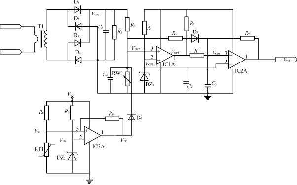 借助上述電路我們可以很容易地構(gòu)成,輸入過(guò)、欠壓保護(hù),輸出過(guò)、欠壓保護(hù),以及過(guò)熱保護(hù)。在此僅以附加過(guò)熱保護(hù)為例,說(shuō)明如下:如圖1所示,過(guò)熱保護(hù)線路是由IC3A及其周邊元件組成。當(dāng)電源的溫度沒(méi)有超過(guò)設(shè)定溫度時(shí),Vot1<Vot2,運(yùn)放IC3A的輸出電壓Vot3為低電平,由于有二極管D6的存在,此時(shí)IC3A的輸出電壓Vot3不會(huì)影響到VOP2的電壓,也就是說(shuō)在過(guò)熱保護(hù)線路未起作用時(shí),它不會(huì)影響到上述的過(guò)流保護(hù)線路的性能。當(dāng)電源的溫度超溫時(shí)Vot1>Vot2,運(yùn)放IC3A的輸出電壓Vot3變?yōu)楦唠娖?,通過(guò)二極管D6,使VOP2的電壓升高,從而觸發(fā)過(guò)流保護(hù)線路使電源進(jìn)入停止工作期。只有當(dāng)電源溫度降低到超溫保護(hù)點(diǎn)以下時(shí),電源才能重新進(jìn)入正常工作狀態(tài)。依此類推可以構(gòu)成其它輸入輸出過(guò)、欠壓保護(hù)線路。在此不再贅述。