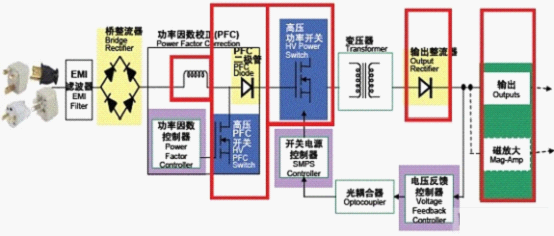 在一個(gè)電源設(shè)計(jì)中,能效規(guī)范對(duì)電路段的挑戰(zhàn)主要體現(xiàn)在PFC能效、主轉(zhuǎn)換器能效和次級(jí)能效幾個(gè)方面。要提高這幾個(gè)方面的能效,就必須改善如圖1所示電路紅色框中的元件性能。以下將介紹改善電路段能效的幾種方法。