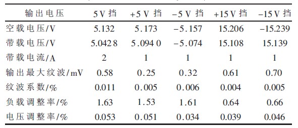 測(cè)試儀器采用固緯4 位半數(shù)字萬用表(GDM-8245) 、上海愛儀交流毫伏表(AS2294D) 和調(diào)壓變壓器(TDGC -0.5/0.5) .負(fù)載電阻采用水泥電阻(2.5Ω/20 W、5Ω/20 W、15Ω/20 W) .電源性能參數(shù)如表1 所示??梢钥闯觯?負(fù)載調(diào)整率和電壓調(diào)整率反映出了電源較高的穩(wěn)定度, 紋波系數(shù)指標(biāo)反映出低紋波特性。
