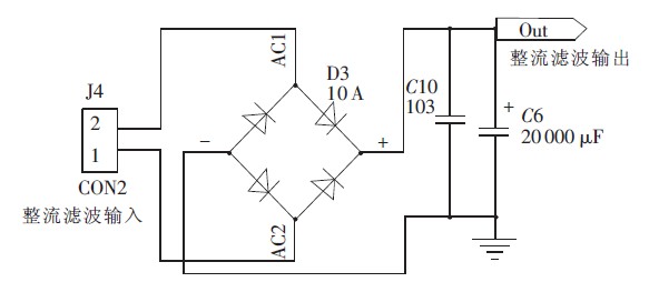 整流濾波電路主要由整流橋堆和大容量濾波電容組成, 如圖2 所示。整流橋堆具有體積小巧、輸出電流大、安裝方便等優(yōu)勢(shì), 并能代替由4 只二極管組成的傳統(tǒng)橋式整流電路。濾波電路采用大容量電解電容濾波,增加了輸出電壓的穩(wěn)定性。根據(jù)式(1) 可求出所需濾波電容容量。