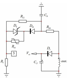 在眾多設(shè)計(jì)中,必須保護(hù)適配器免受熱失控(如適配器殼體內(nèi)溫度超過(guò)特定值)影響。我們可以通過(guò)跟齊納二極管(D10)串聯(lián)一個(gè)負(fù)溫度系數(shù)(NTC)電阻(R14)來(lái)應(yīng)用簡(jiǎn)單的 OTP(如圖 3 所示)。當(dāng)溫度升高時(shí),NTC電阻開(kāi)始下降,并升高引腳 3 的電壓。當(dāng)引腳 3 的電壓電平達(dá)到 3 V 時(shí),器件就簡(jiǎn)單地閂鎖,并要求復(fù)位,然后重啟。