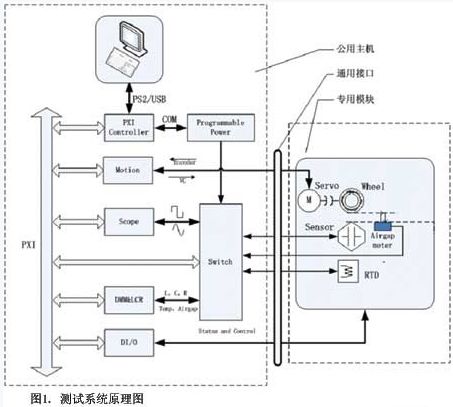 目前,汽車傳感器沒有一個統(tǒng)一的行業(yè)標(biāo)準(zhǔn),基本是按照使用者的要求定制。譬如目標(biāo)輪及其轉(zhuǎn)速、空氣氣隙和傳感器的安裝尺寸各不相同,即使是傳感器裝配到同一種車型上,也會隨著安裝位置的不同而存在差異。但是,同一臺設(shè)備不可能滿足全部傳感器的測試要求,由此引入模塊化的設(shè)計思想,即系統(tǒng)中相同的部分,如測試儀器、測試軟件、氣動控制系統(tǒng)、主電路系統(tǒng),作為公用資源(這里稱為“主機”);對系統(tǒng)中要求隨著傳感器變化的部分,如目標(biāo)輪及馬達(dá)、夾具及專用電路,被看成模塊。主機和模塊之間采用快插的方式完成電氣連接且為標(biāo)準(zhǔn)化接口,可進(jìn)行后續(xù)擴展。當(dāng)測試不同傳感器時,選用不同的測試模塊連接到主機上即可。