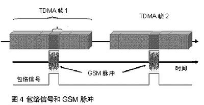 特定的手機(jī)只在屬于它的時(shí)間空當(dāng)發(fā)射。包絡(luò)信號的基本頻率是1/4.615 ms=217Hz。諧波頻率為434Hz、651Hz等。如此頻率是聽得到的。如圖4所示,為手機(jī)的包絡(luò)信號。