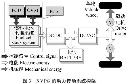 另一種構(gòu)架是并聯(lián)式的燃料電池混合動(dòng)力系統(tǒng)的結(jié)構(gòu)。這種構(gòu)建通常在燃料電池和電機(jī)控制器之間安裝了一個(gè)DC/DC變換器,燃料電池的端電壓通過(guò)DC/DC變換器的升壓或降壓來(lái)與系統(tǒng)直流母線的電壓等級(jí)進(jìn)行匹配。這種系統(tǒng)與上述構(gòu)架不同之處還在于,這種動(dòng)力系統(tǒng)的設(shè)計(jì)沒有考慮能量的回饋回收,因此系統(tǒng)雖然簡(jiǎn)單,但效率比較低下。
