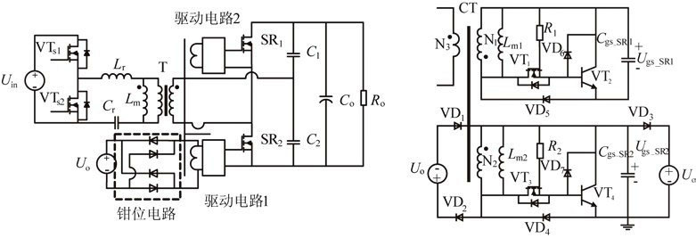 圖7為幾種典型的電流型驅(qū)動(dòng)方案。傳統(tǒng)的電流型驅(qū)動(dòng)方案如圖7(a)所示,整個(gè)驅(qū)動(dòng)電路包括一個(gè)電流互感器(CT)和一個(gè)電壓箝位電路。電路通過電流互感器對電流信號進(jìn)行采樣,并給同步管提供相應(yīng)的驅(qū)動(dòng)信號,多余的驅(qū)動(dòng)能量被箝位電路消耗。該驅(qū)動(dòng)電路比較簡單,但是有較大的驅(qū)動(dòng)損耗,限制了變流器效率的提高。因此有文獻(xiàn)提出了具有剩余驅(qū)動(dòng)能量回饋功能的電流型驅(qū)動(dòng)方案,如圖7(b)所示。該驅(qū)動(dòng)電路中多余的驅(qū)動(dòng)能量能通過輔助繞組回饋到主電路,從而可以較大的減少驅(qū)動(dòng)電路的損耗,并簡化電流互感器的設(shè)計(jì),但是多繞組的電流互感器大大增加了生產(chǎn)成本。另有文獻(xiàn)提出了一種更為簡單的電流型驅(qū)動(dòng)方案,如圖7(c)所示。該方案的電流互感器只需一個(gè)副邊繞組,同時(shí)也具有剩余驅(qū)動(dòng)能量回饋的功能,更加有利于實(shí)際的生產(chǎn)應(yīng)用。通過三極管VTd1,它可以準(zhǔn)確地檢測同步整流管應(yīng)該關(guān)斷的時(shí)刻,從而保證了同步整流電路的可靠性。