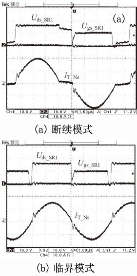 本文針對倍壓整流結(jié)構(gòu)提出的一種新型的電流型同步整流方案,如圖10所示。通過一個(gè)雙繞組電流互感器,既解決了二次側(cè)上管驅(qū)動(dòng)電路采樣的能量回饋問題,又減少了電流互感器的數(shù)量,有利于降低生產(chǎn)成本,提高變換效率及功率密度。圖11為斷續(xù)模式和臨界模式下的主要實(shí)驗(yàn)波形。