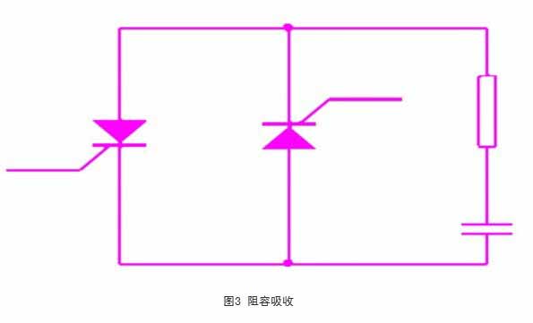 在晶閘管兩端并聯(lián)r-c阻容吸收回路,如圖3所示,利用電容吸收過壓。其實質(zhì)就是將造成過電壓的能量變成電場能量儲存到電容中,然后釋放到電阻中消耗掉。