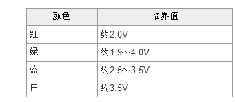 LED具有一般硅二極管的類似特性,在正負(fù)極之間施加電壓。當(dāng)外加電壓達(dá)到一個(gè)臨界值,LED中產(chǎn)生電流,開始發(fā)光。當(dāng)電壓超過(guò)這個(gè)臨界值時(shí),電流急劇增加。白色LED的臨界電壓值約3.5V。紅色、綠色、藍(lán)色的LED臨界電壓值如表1所示。