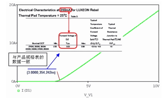 我們用電路仿真來(lái)說(shuō)明LED的電子特性以及驅(qū)動(dòng)電路。電路仿真是對(duì)LED和電阻等的電子設(shè)計(jì)進(jìn)行建模并在計(jì)算機(jī)上模擬計(jì)算電路運(yùn)行的一種簡(jiǎn)易方法。這里使用的是Cadence公司的電路仿真PSpice A/D。同時(shí)使用了飛利浦照明公司的LUXEON系列LX3-PW71。