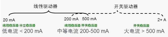 如今在市場(chǎng)上典型的LED驅(qū)動(dòng)器包括兩類,即線性驅(qū)動(dòng)器和開關(guān)驅(qū)動(dòng)器;大概的適用范圍見圖5.如電流大于500mA的大電流應(yīng)用采用開關(guān)穩(wěn)壓器,因?yàn)榫€性驅(qū)動(dòng)器限于自身結(jié)構(gòu)原因,無(wú)法提供這樣大的電流;而在電流低于200mA的低 電流應(yīng)用中,通常采用線性穩(wěn)壓器或分離穩(wěn)壓器;而在200至500mA的中等電流應(yīng) 用中,既可以采用線性穩(wěn)壓器,也可以采用開關(guān)穩(wěn)壓器。