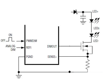 然后用一個PWM信號加到MOS管的柵極,以快速地開關(guān)這串LED。從而實現(xiàn)調(diào)光。也有不少恒流芯片本身就帶一個PWM的接口,可以直接接受PWM信號,再輸出控制MOS開關(guān)管。