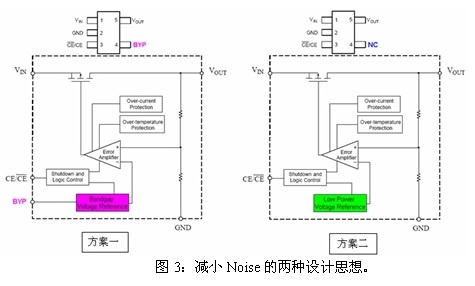 方案一中,如不加bypass電容,CMOS LDO的噪聲一般在200~450uVrms(沒有負(fù)載時的電源電流越小,這個噪聲越大),加了這個電容濾波后,LDO的噪聲一般為30~50 uVrms,因此方案一的低噪聲CMOS LDO都是有這個Bypass腳,并且是必須加這個濾波電容才能做到低噪聲。