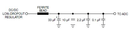 隔離來自ADC開關(guān)噪聲的一個關(guān)鍵元件是電源濾波器,它包括一個鐵氧體磁環(huán)和旁路電容。在選擇鐵氧體磁環(huán)時應(yīng)考慮多個關(guān)鍵特性。首先,鐵氧體磁環(huán)必須有用于數(shù)據(jù)轉(zhuǎn)換器的充足額定電流,它必須有低的DCR(直流阻抗),以盡量減少磁環(huán)自身的壓降。例如,當(dāng)一個200mA電源通過一個DCR為1Ω的磁環(huán)時,產(chǎn)生一個200mV的壓降。這個壓降可能將ADC上的電壓推至邊沿,考慮到電源電壓的標(biāo)準(zhǔn)差,ADC電壓甚至可能低于建議的工作電壓?! ?br />