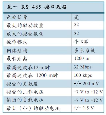 表一詳細(xì)的說明了RS-485 接口的規(guī)范。主要的參數(shù)包括-7V 到+12V 的工作電壓,32Mbps 的數(shù)據(jù)傳輸速度已經(jīng)1200 米的傳輸距離等。一個完全兼容的RS-485 接口必須符合 IEC61000-4-2(靜電),IEC61000-4-4(群脈沖)和 IEC61000-4-5 (浪涌)標(biāo)準(zhǔn)。