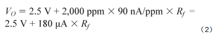 傳感器的最大響應(yīng)為90 nA/ppm,如表2所示,其最大輸入范圍為2,000 ppm。因此,最大輸出電流為180 μA,最大輸出電壓由跨導(dǎo)電阻決定,如公式2所示。
