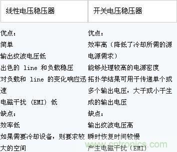 1.線(xiàn)性穩(wěn)壓器與開(kāi)關(guān)穩(wěn)壓器的主要優(yōu)劣勢(shì)特點(diǎn)如下表所示: