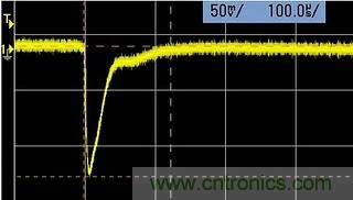 這是任何電源都存在的正常現(xiàn)象。當(dāng)負(fù)載吸收電流發(fā)生跳變的瞬間,就會(huì)造成電源輸出端的電壓瞬間偏離設(shè)定值。這個(gè)示波器屏幕的截圖(圖1),就是當(dāng)我的一個(gè)電源的負(fù)載電流,從1mA 瞬間變化到500mA時(shí), 輸出電壓經(jīng)歷了約30uS 瞬間變化。