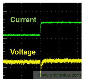 為了減小瞬態(tài)電壓變化幅度,可以采用在電路中并聯(lián)一個(gè)大電容的方式,平滑電壓的跌落或過(guò)沖幅度,但這也會(huì)導(dǎo)致瞬態(tài)響應(yīng)時(shí)間更長(zhǎng),如圖4所示。